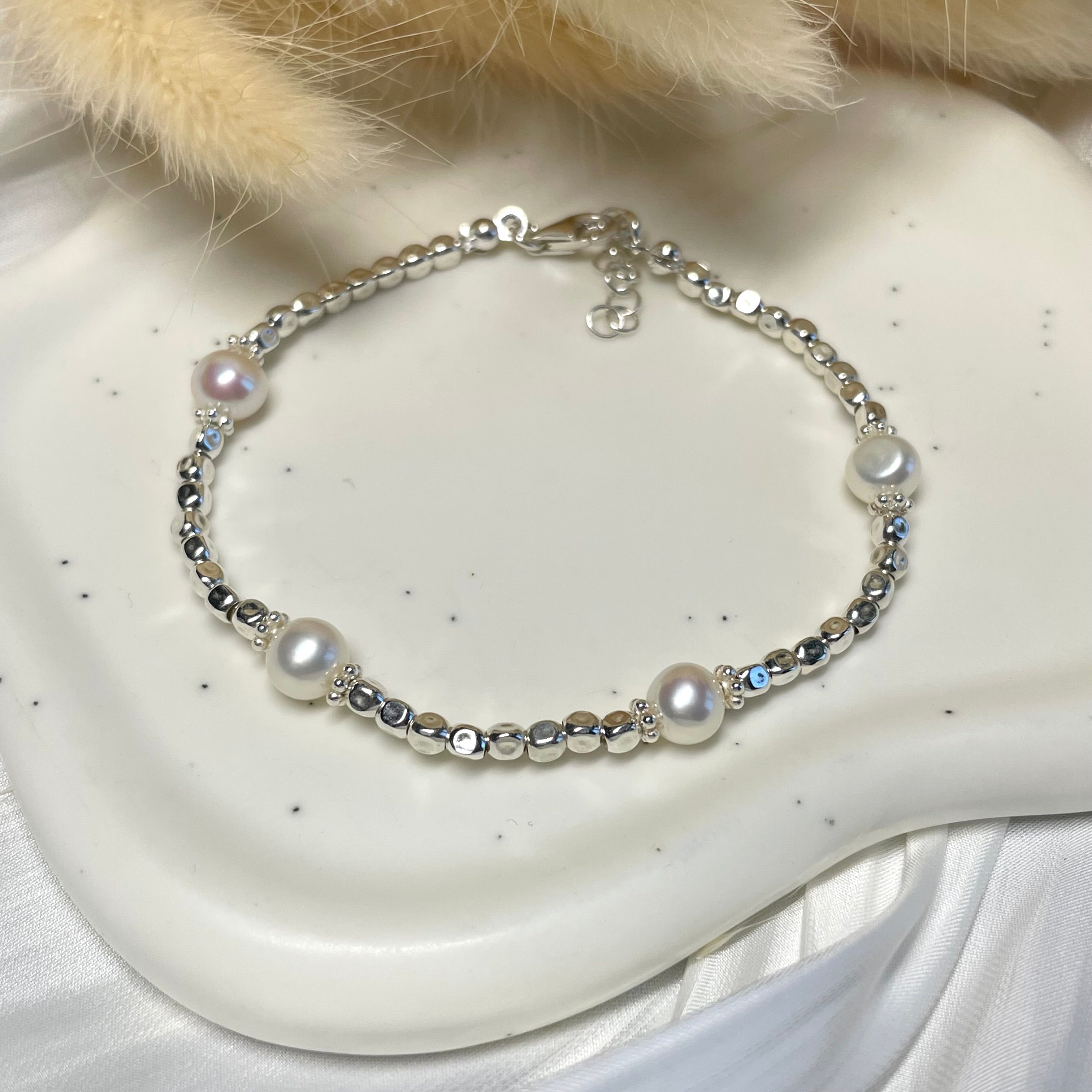 Bracciale in argento925 con pepite mini martellate e con perle di fiume AAA. Chiusura a moschettone. Misura standard 17,5cm + prolunga ( se si vuole una misura diversa scriverlo nelle note)