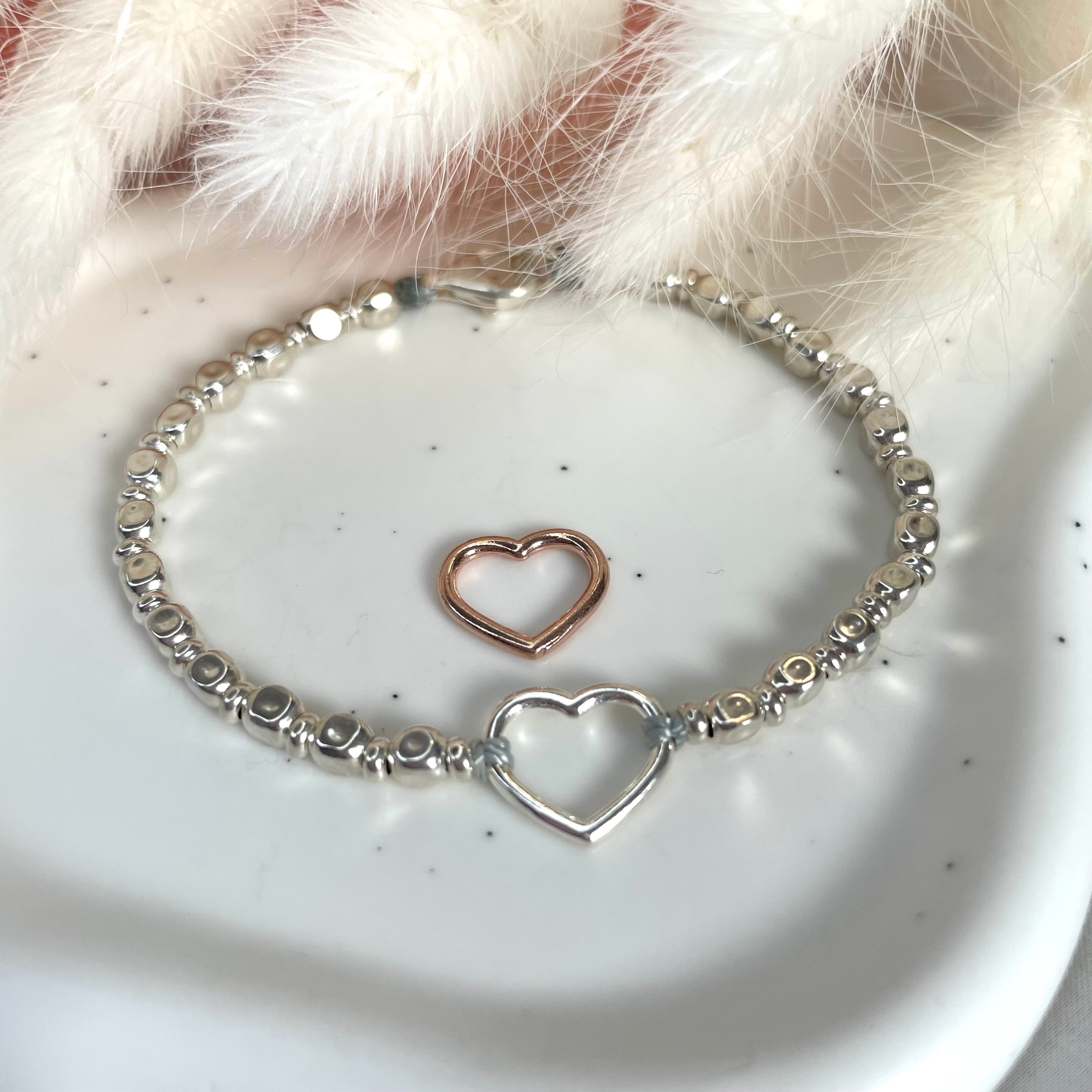 Bracciale in argento925 con pepite martellate e rondelline ed elemento centrale cuore vuoto piccolo. Se si vuole il cuore rosato bisogna specificarlo nelle note e in base alla disponibilità verrà soddisfatta la richiesta.