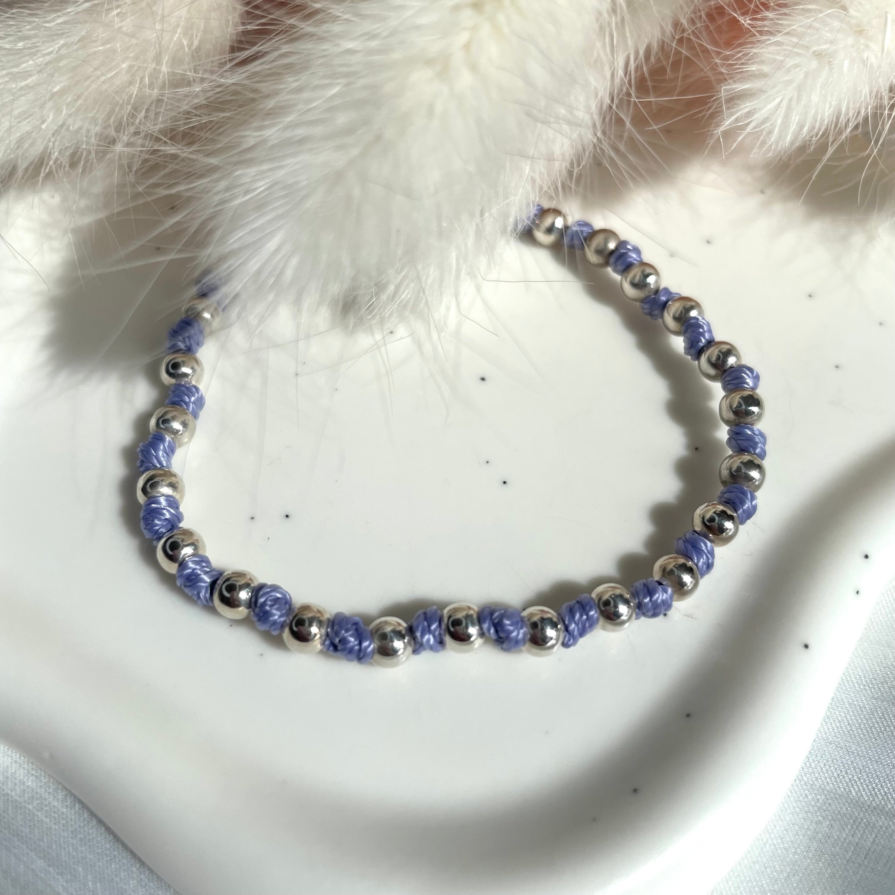 Bracciale in argento925 con palline piccole intervallate a nodini in filo nautico colorato.