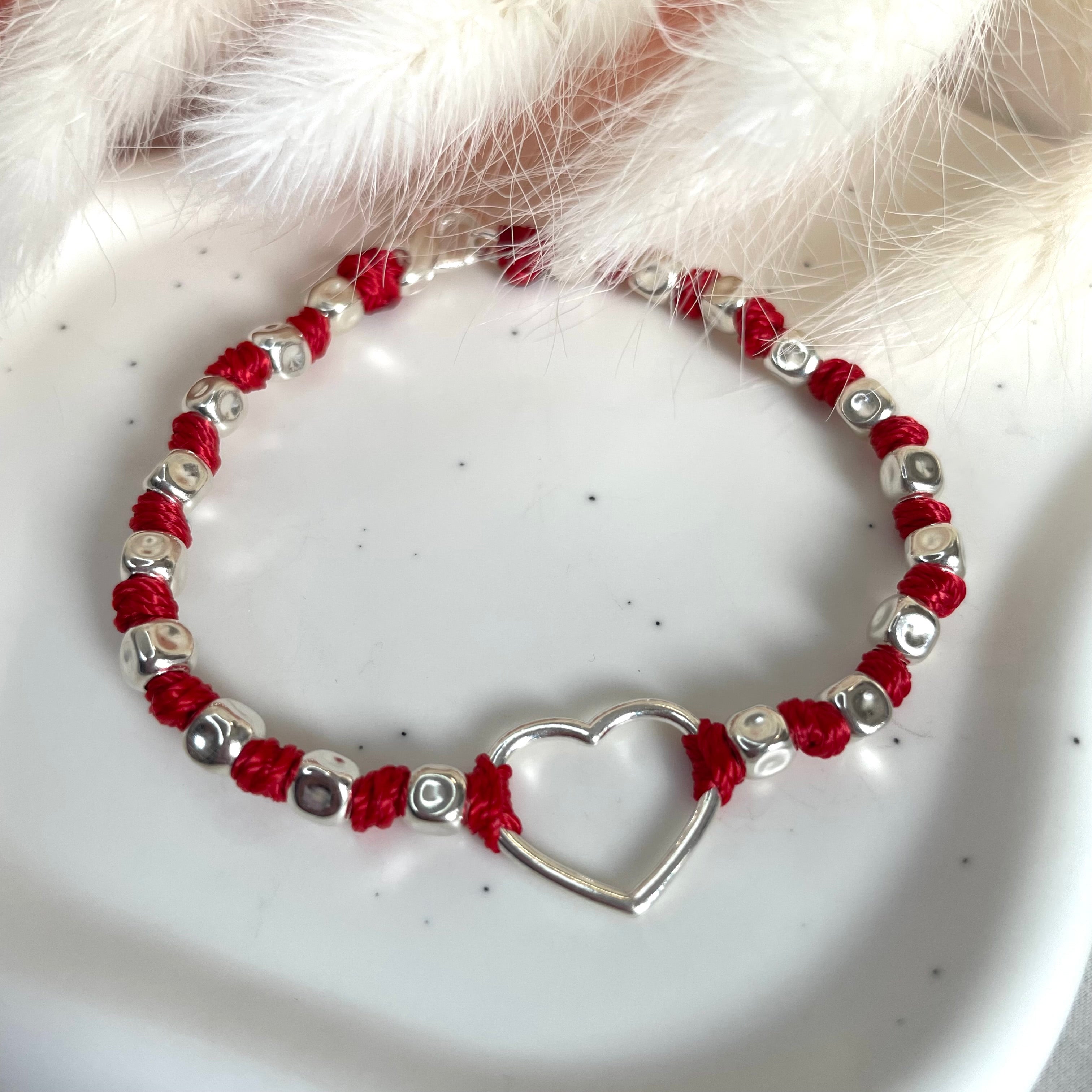 Bracciale in argento925 con pepite medie + cuore grande vuoto e nodi in filo nautico colorato.
