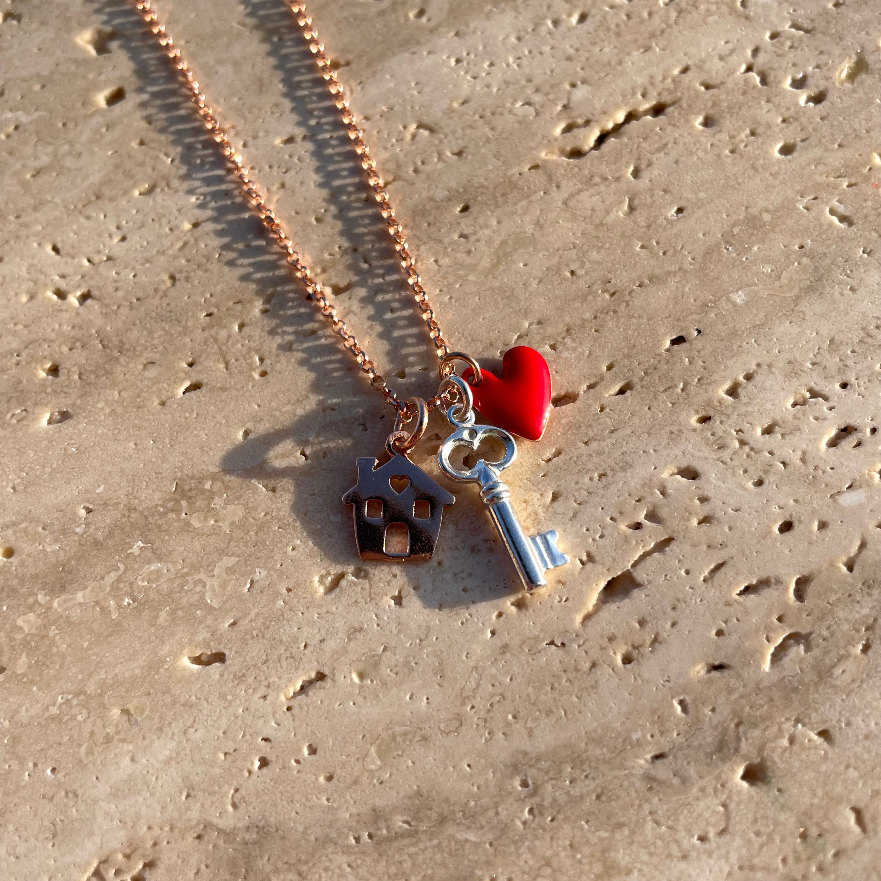 CL047 Collana con casa, chiave e cuore smaltato rosso