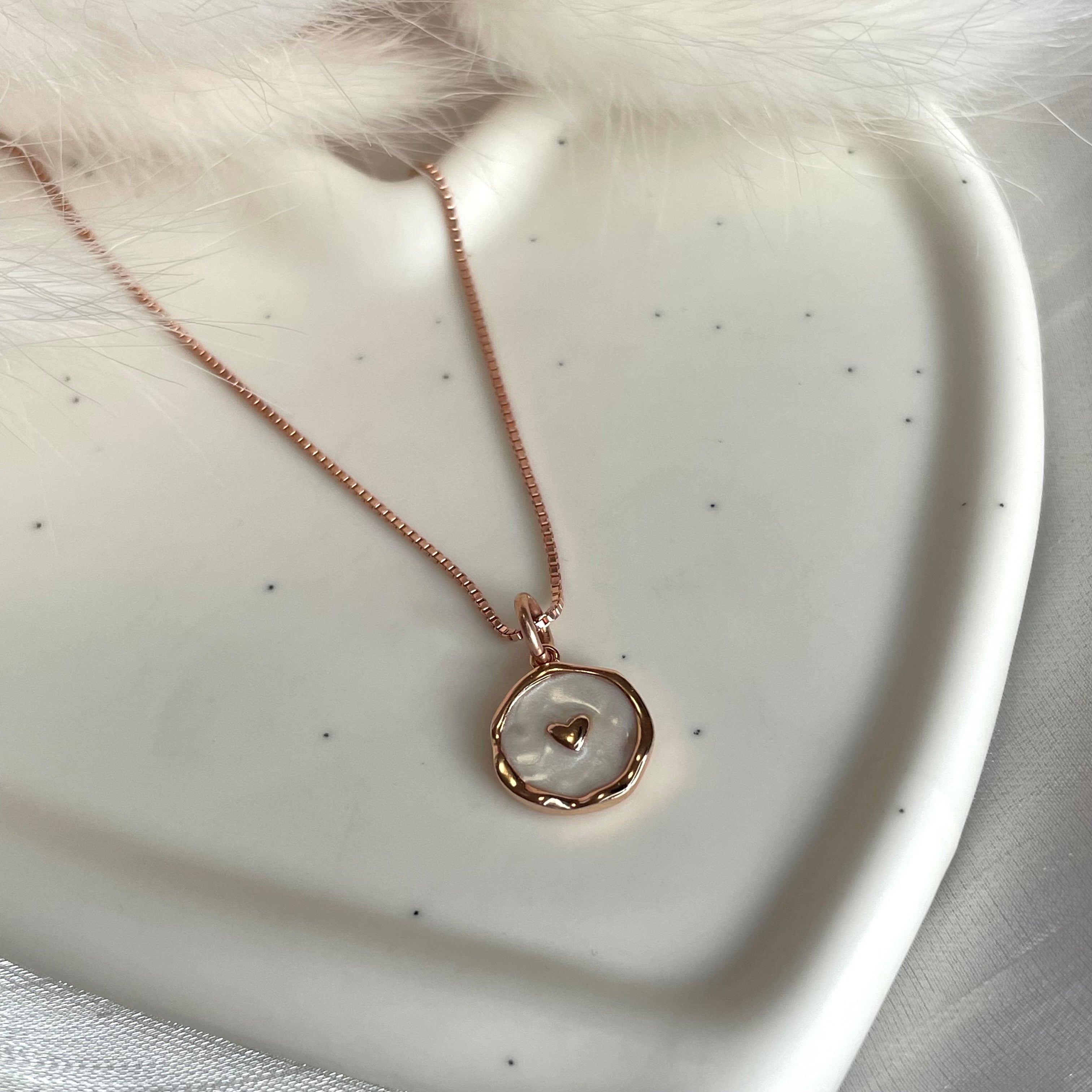 Collana con catena veneziana in argento 925 rosata con medaglietta rosata con smalto madreperlato e cuoricino al centro.