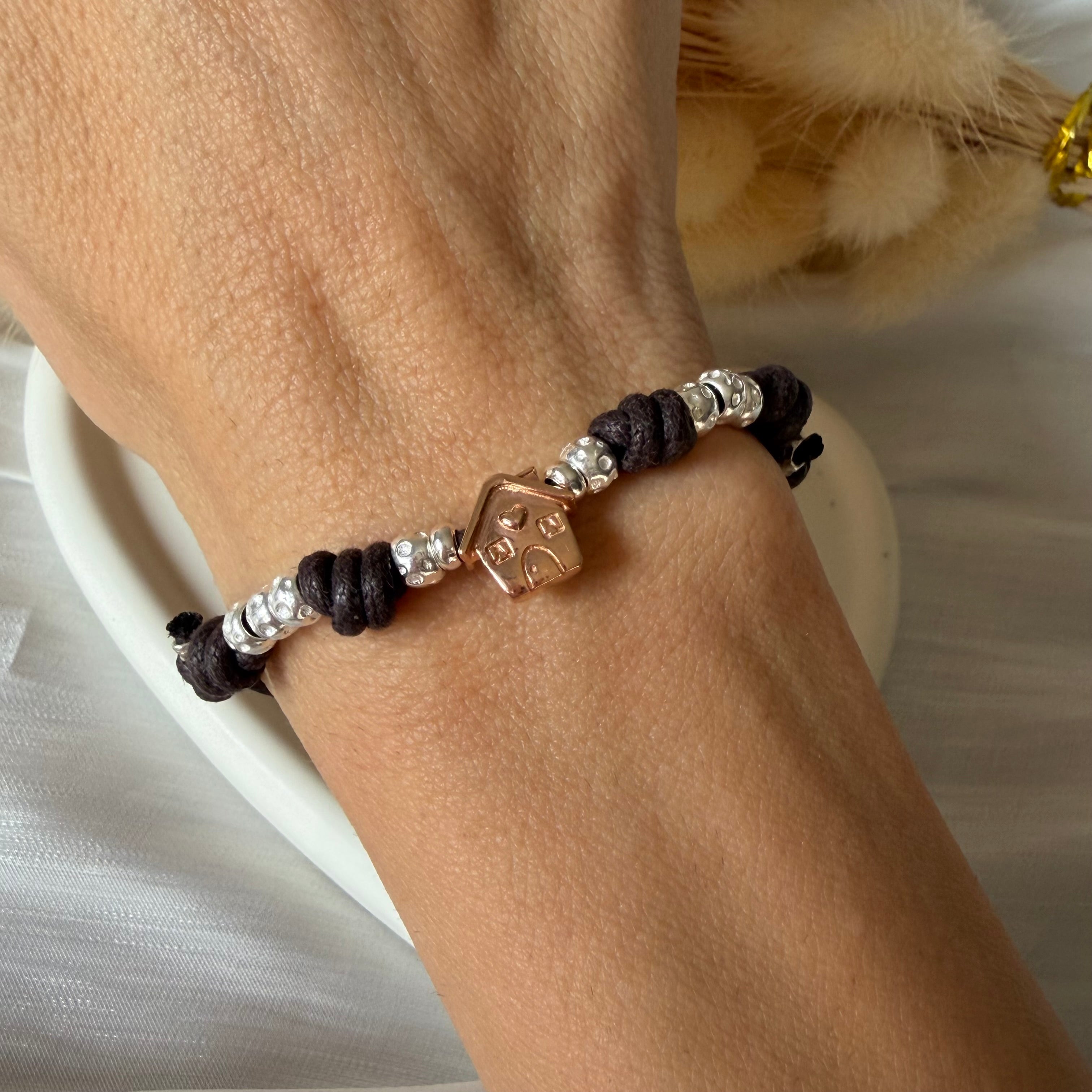 Bracciale unisex in argento925 con cordino cerato (colore a scelta) 4 nodi e granelli nuovi con al centro il passante casina Family.