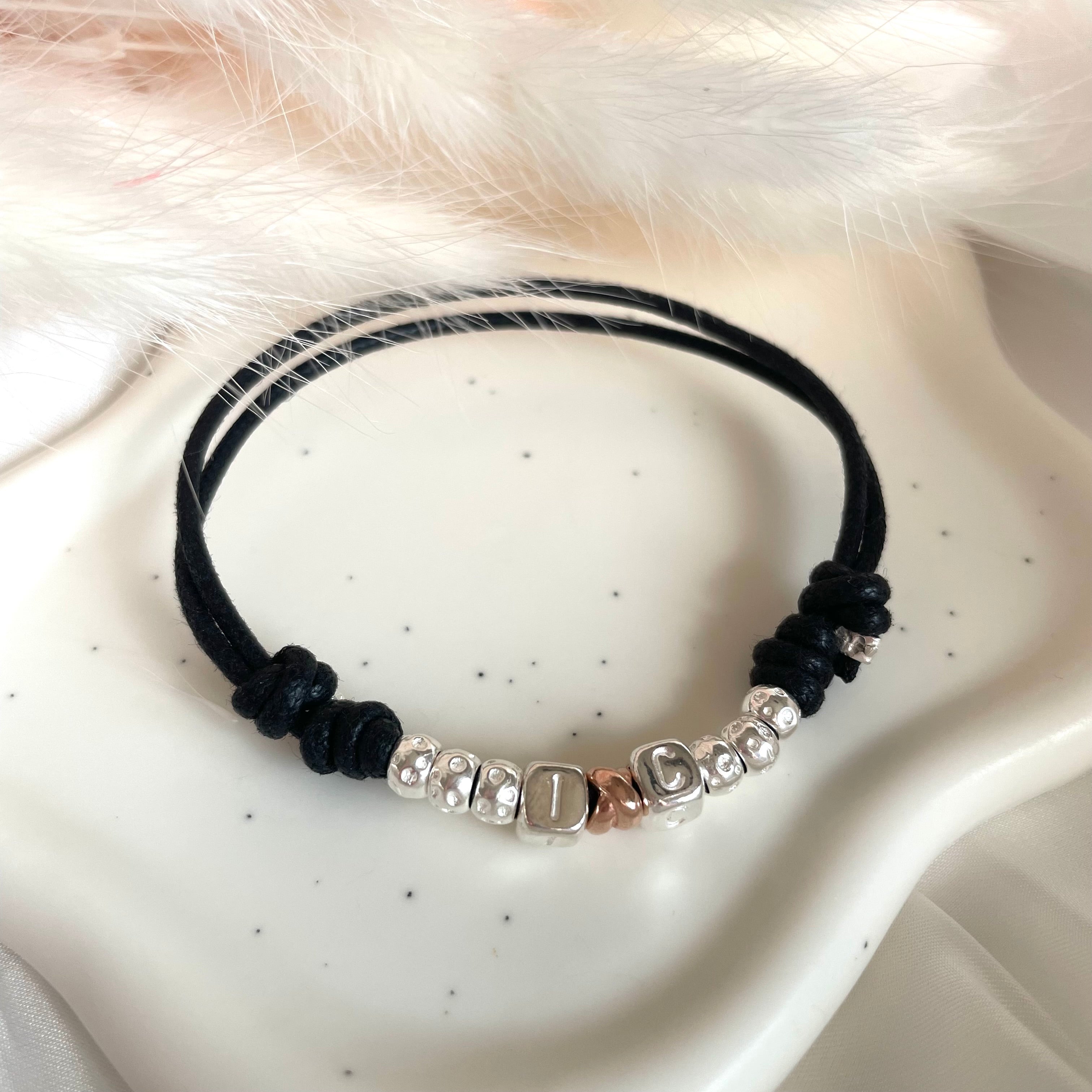 B142 Bracciale con cordino cerato, granelli nuovi, iniziali passanti e intreccino simbolo di unione