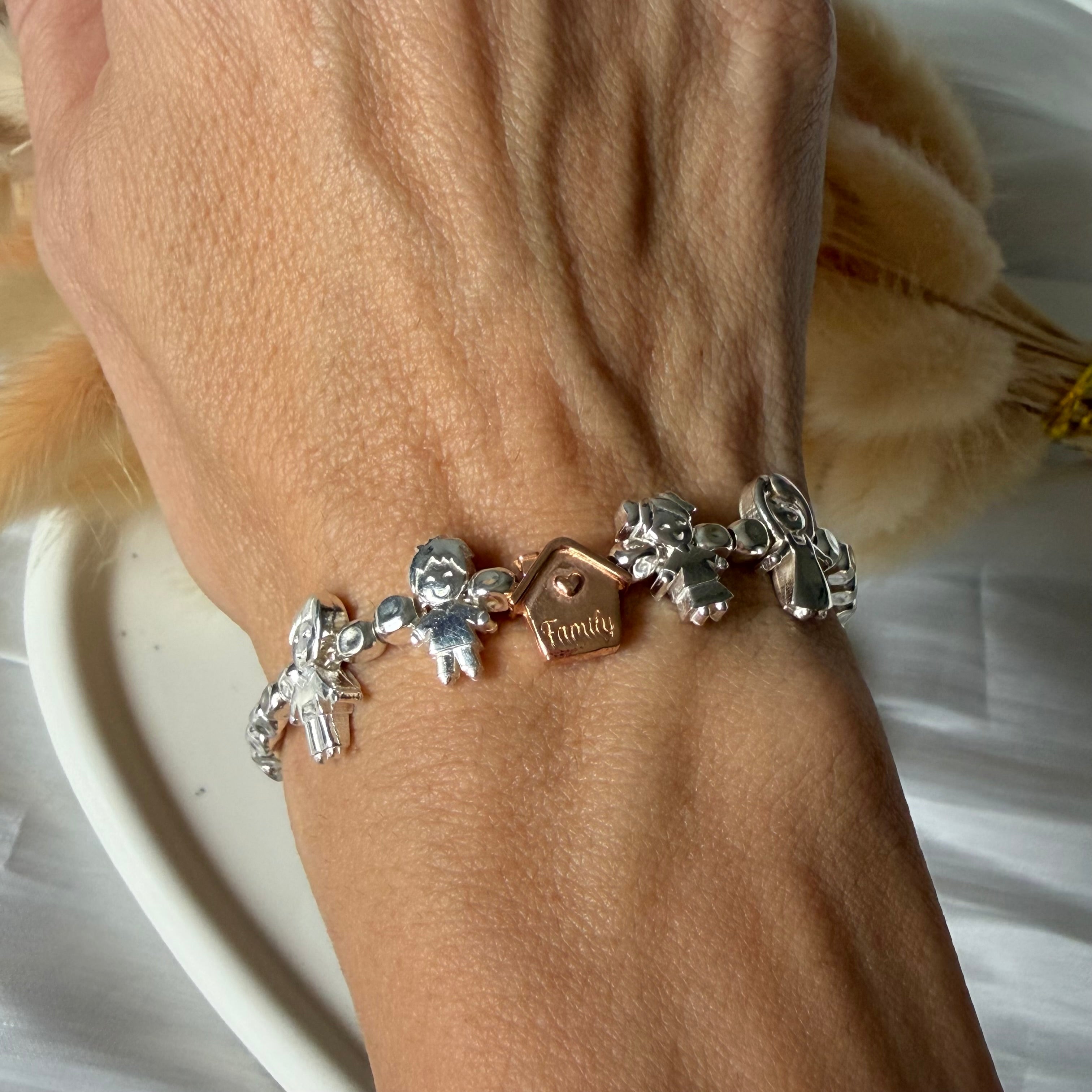 Bracciale in argento925 con pepite piccole martellate ed elementi Family passanti (casa, genitori, bimbi e/o zampa).