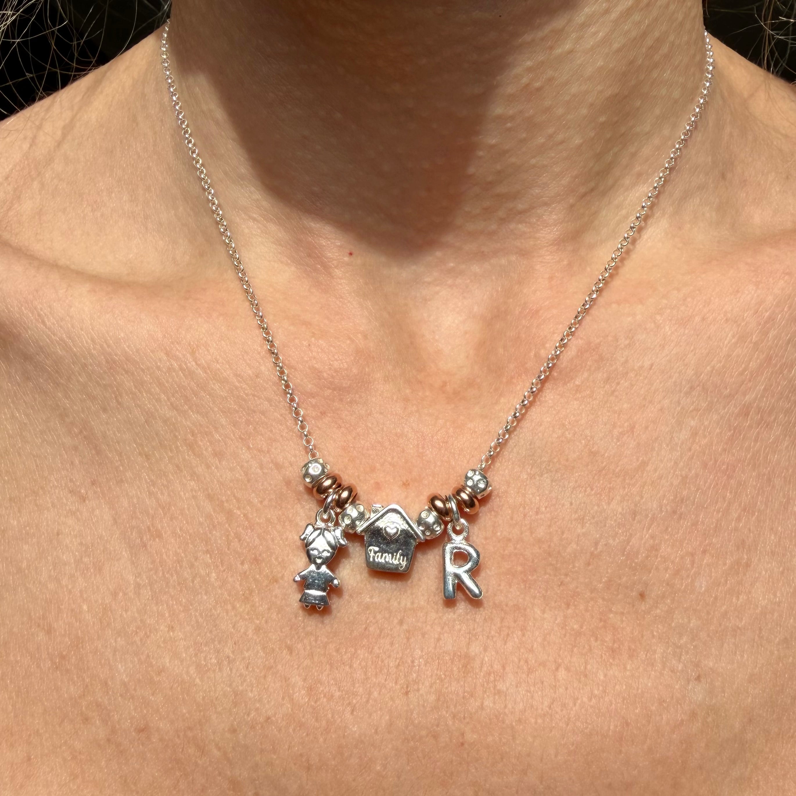 CL0130 Collana Family con ciondoli Family First, casina passante e iniziale pendente