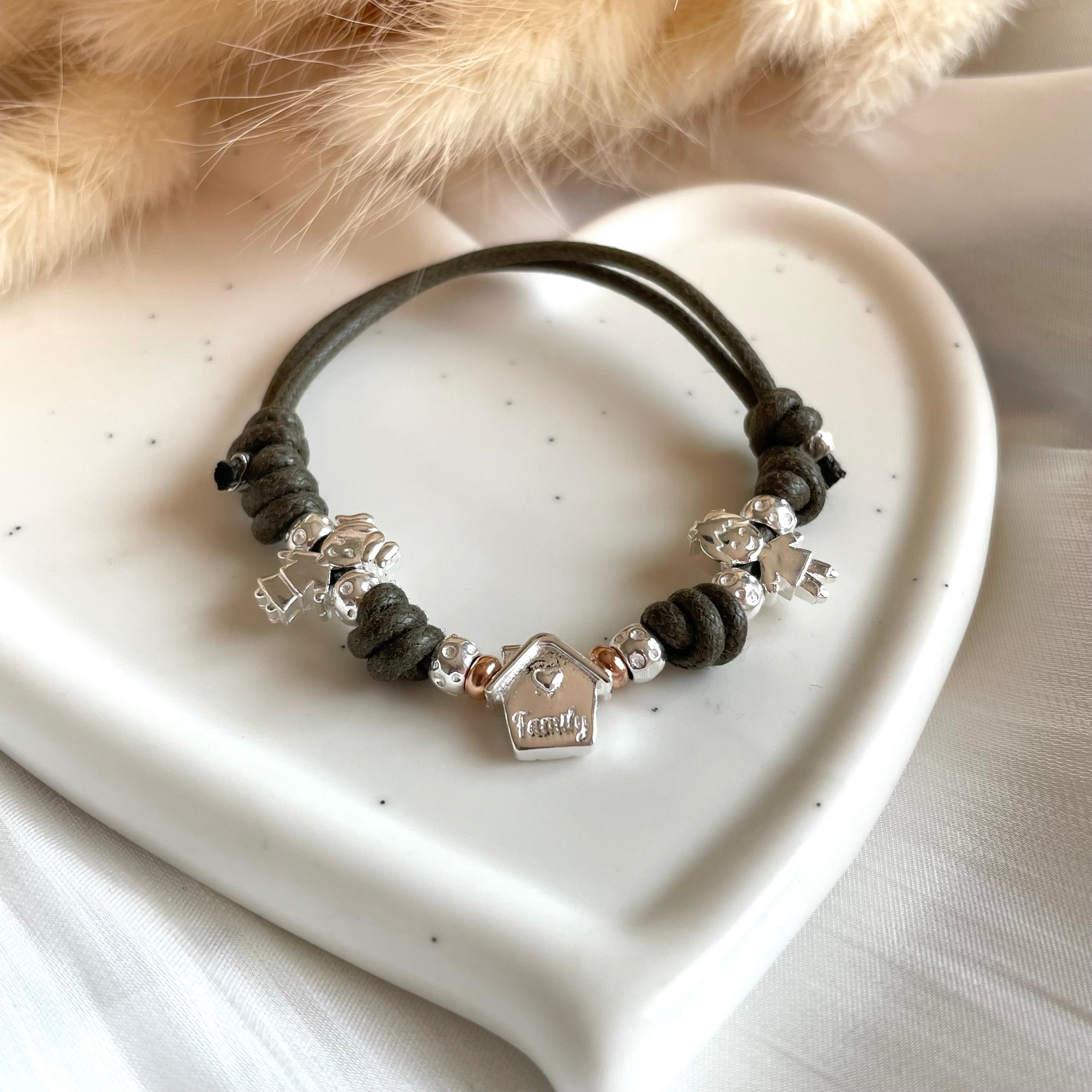 Bracciale in argento925 cordino cerato con granelli nuovi, elementi Family passanti (casina, bimbo o bimba).