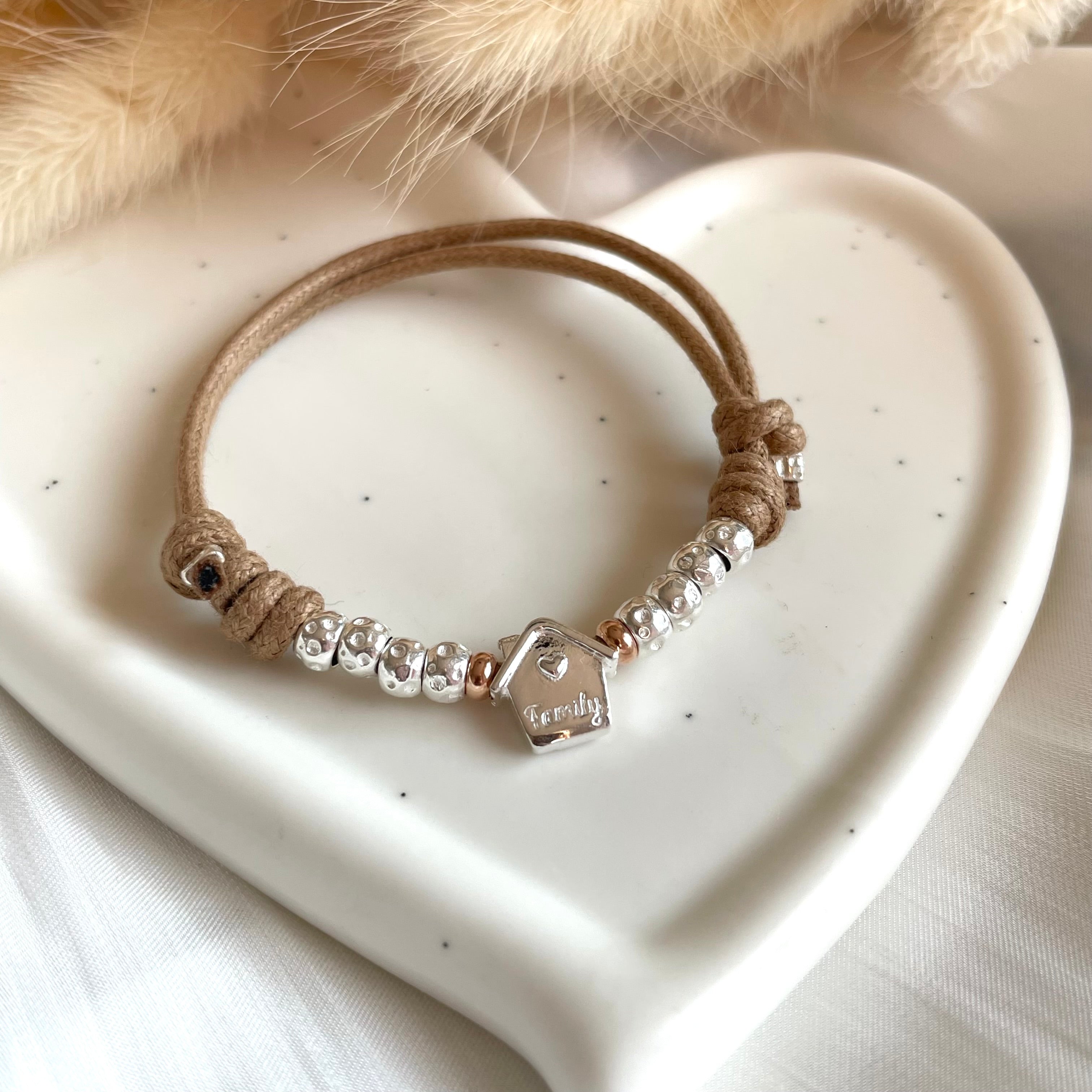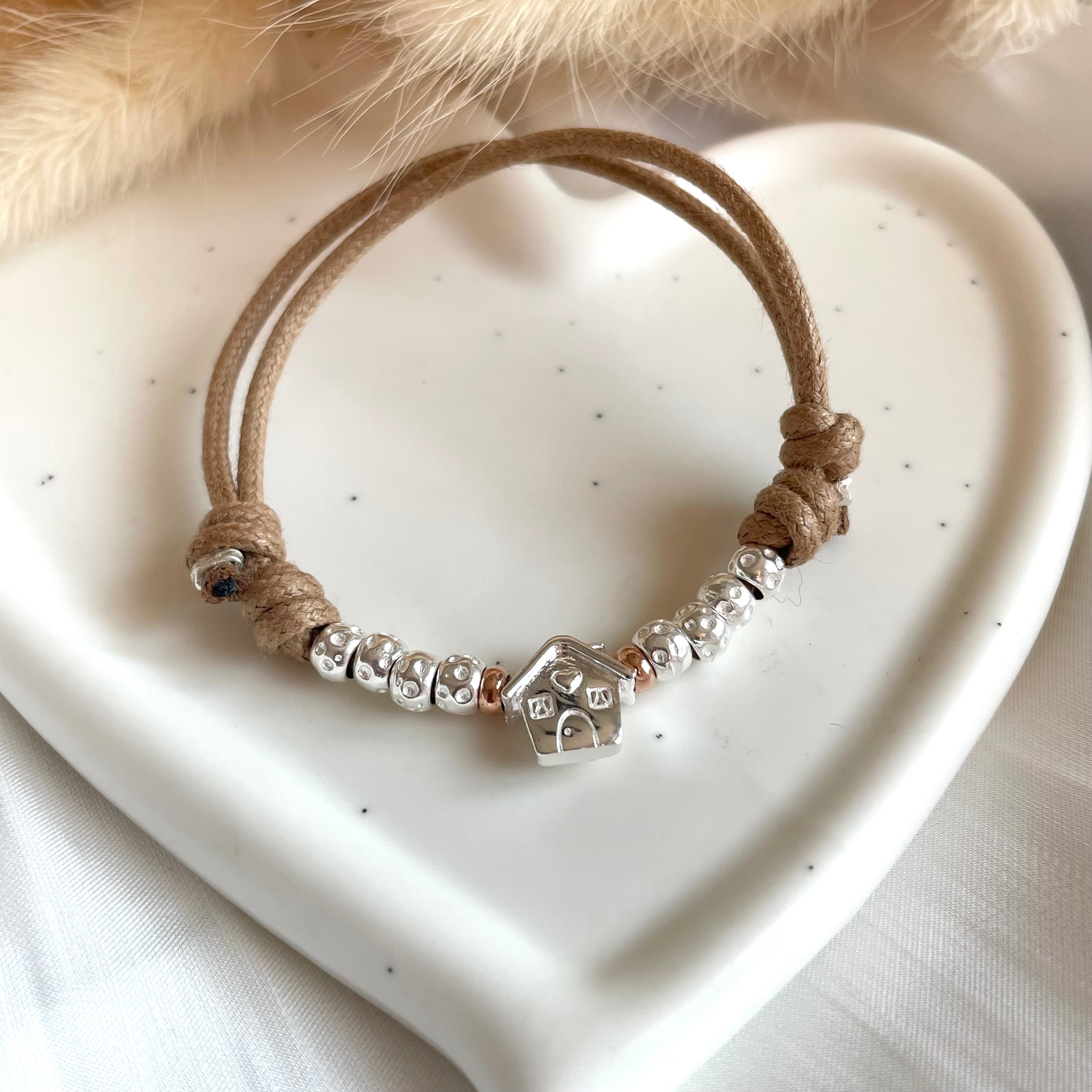 Bracciale unisex in argento925 con cordino cerato (colore a scelta) e granelli nuovi con al centro il passante casina Family.