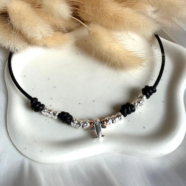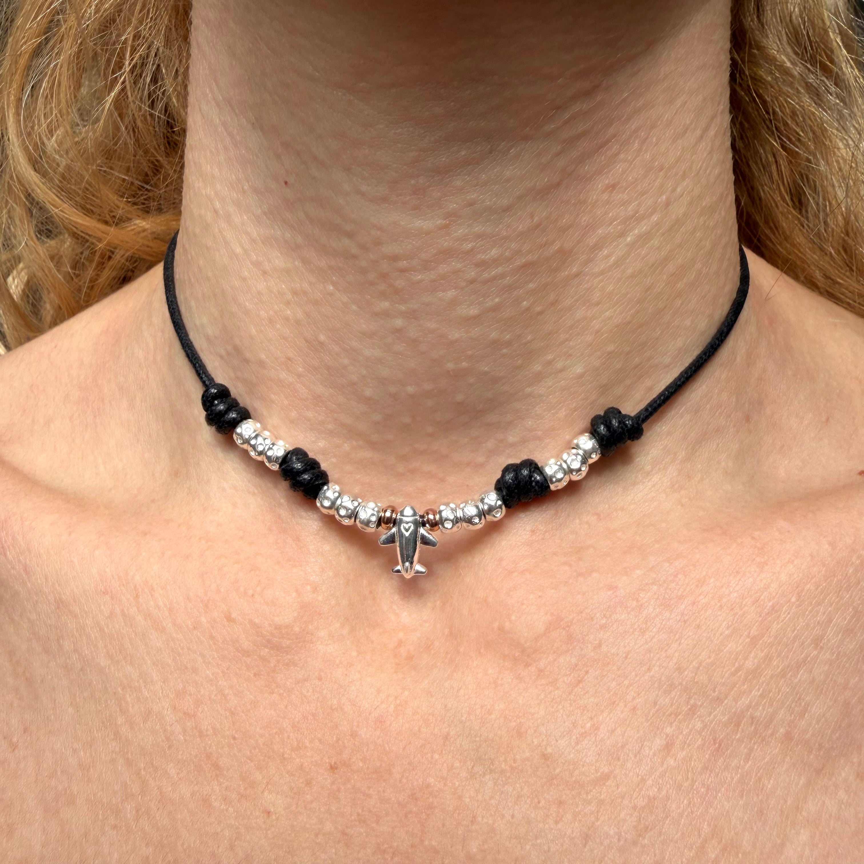 CL0135 Collana viaggi con cordino cerato granelli e aereo passante
