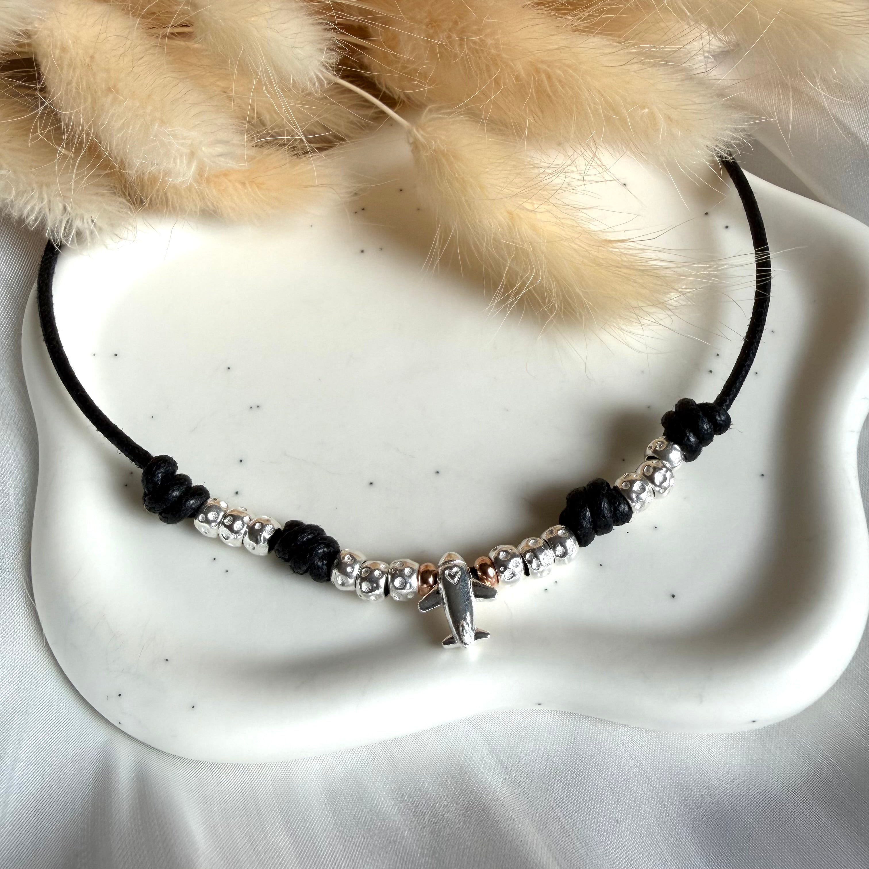 Collana in argento925 viaggi con cordino cerato colorato (ce ne sono disponibili molti nella sezione colori), granelli nuovi tipo Dodo e 2 rondelle rosate o dorate in argento925 e aereo passante.
