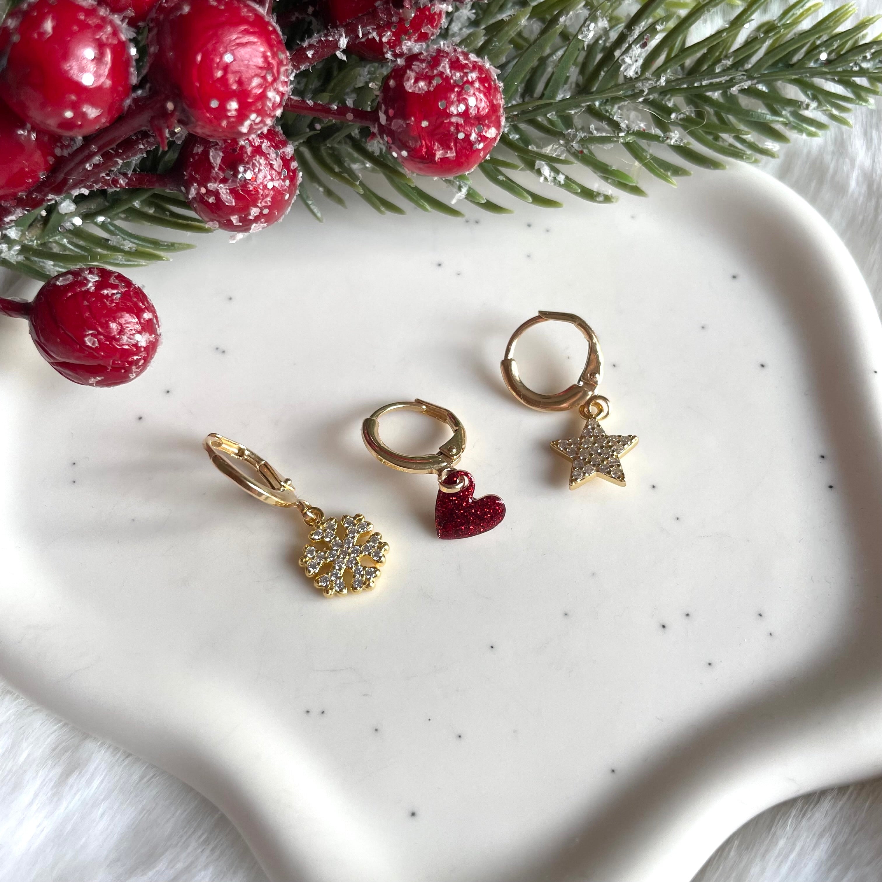 Mono orecchini anelle dorate in argento 925 con simboli del Natale.