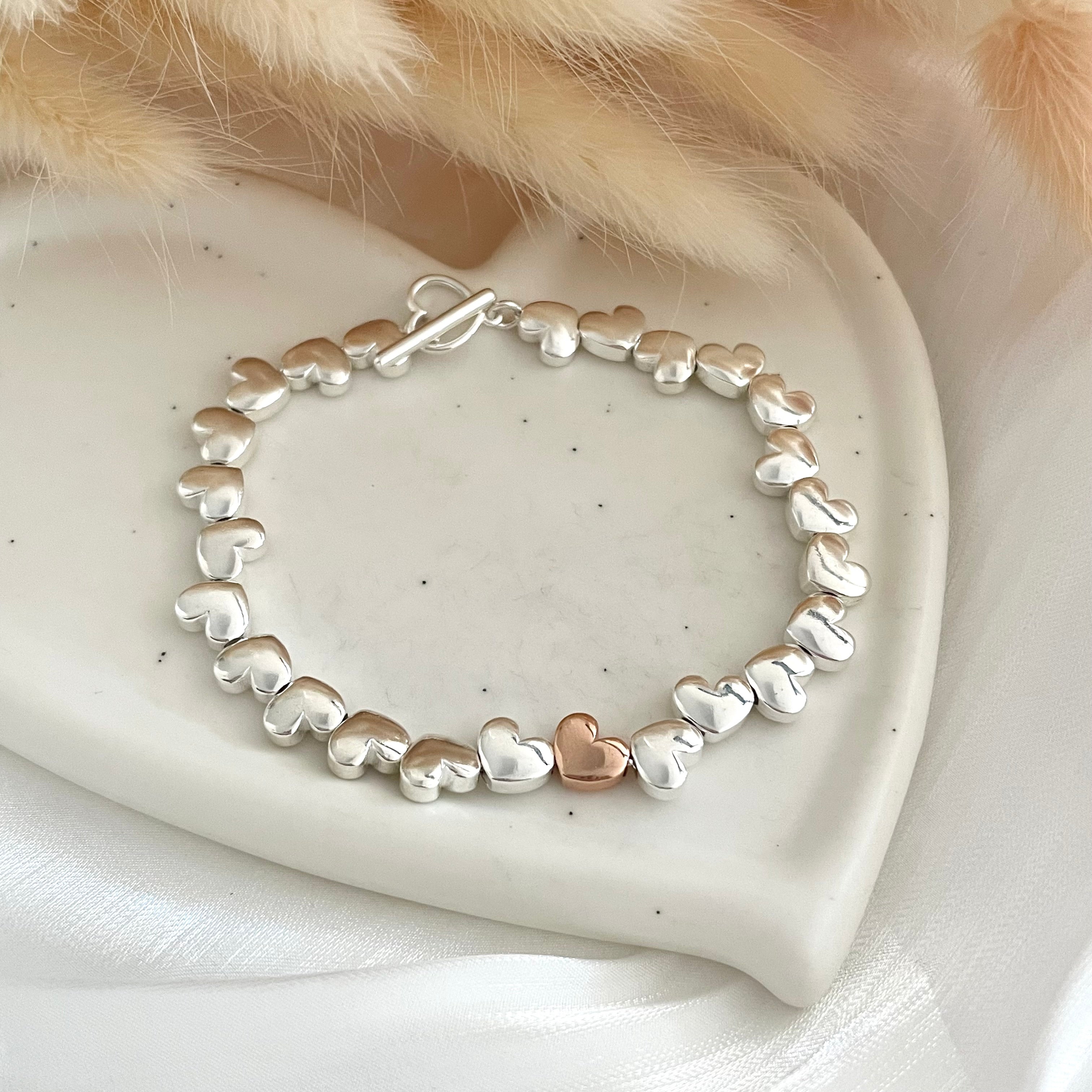 Bracciale in argento925 con cuoricini grandi. E' possibile avere alcuni cuori rosati, da selezionare nell'apposita sezione.